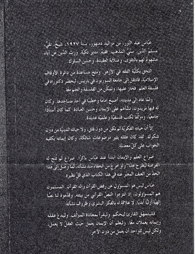 لهذا الكتاب قصة، فقبل صدوره اقترح عليّ بعضهم إصدار ملخّص صغير له يكون مسباراً أو بالون اختبار أعرف به مدى استعداد تقبّل الرأي العام له. ولكن من يجرؤ على نشر ملخص كهذا؟ لقد عرضت الكتاب على الإنس والجن فأبوا نشره، فهل يمكن لملخصه أن يجعله مستساغاً للقارئ المسلم؟ أشك في ذلك. وأخيراً أبدى أحد آباء الكنيسة المدعوم من السلطات الدينية في مدينة جونية استعداده لكتابة التلخيص ونشره معاً على مسؤوليته. لقد توسمت فيه الصدق والأمانة والعفّة والنزاهة والموضوعية ككثيرين غيره من رجال الدين المسيحيين الحقيقيين الذين تعتز بهم الكنيسة والذين نذروا أنفسهم لخدمة دينهم ومجتمعهم، فهو أب محترم وأستاذ اللاهوت في جامعة الكسليك. ولذلك لم أتردد في تفويضه أمر الكتاب بعد تقديم جزيل الشكر له. ولم أكن أعلم أنه صاحب – بل بطل – كتب أبي موسى الحريري المشهورة بالدس والتحريض الطائفي، وبالتالي لم أكن أعلم أنه ثعلب يتربّص بالفريسة شراً. وعلى كل حال وقّعت معه اتفاقاً شرطت عليه فيه أن يكون منصفاً في حقي وحق الكتاب، فيذكر رأيي بأمانة في المسيحية كما في الإسلام بلا زيادة ولا نقصان، ذلك أن كتابي لا يكتفي بنقد الإسلام والقرآن بل أضاف إليه نقداً آخر للمسيحية، عسى أن يشفع لي هذا التوازن في تخفيف بعض النقمة عليّ. وأخيراً صدر الكتاب باسم مستعار “عباس عبد النور” عن دار نشر مصرية زيادة في التعمية.
